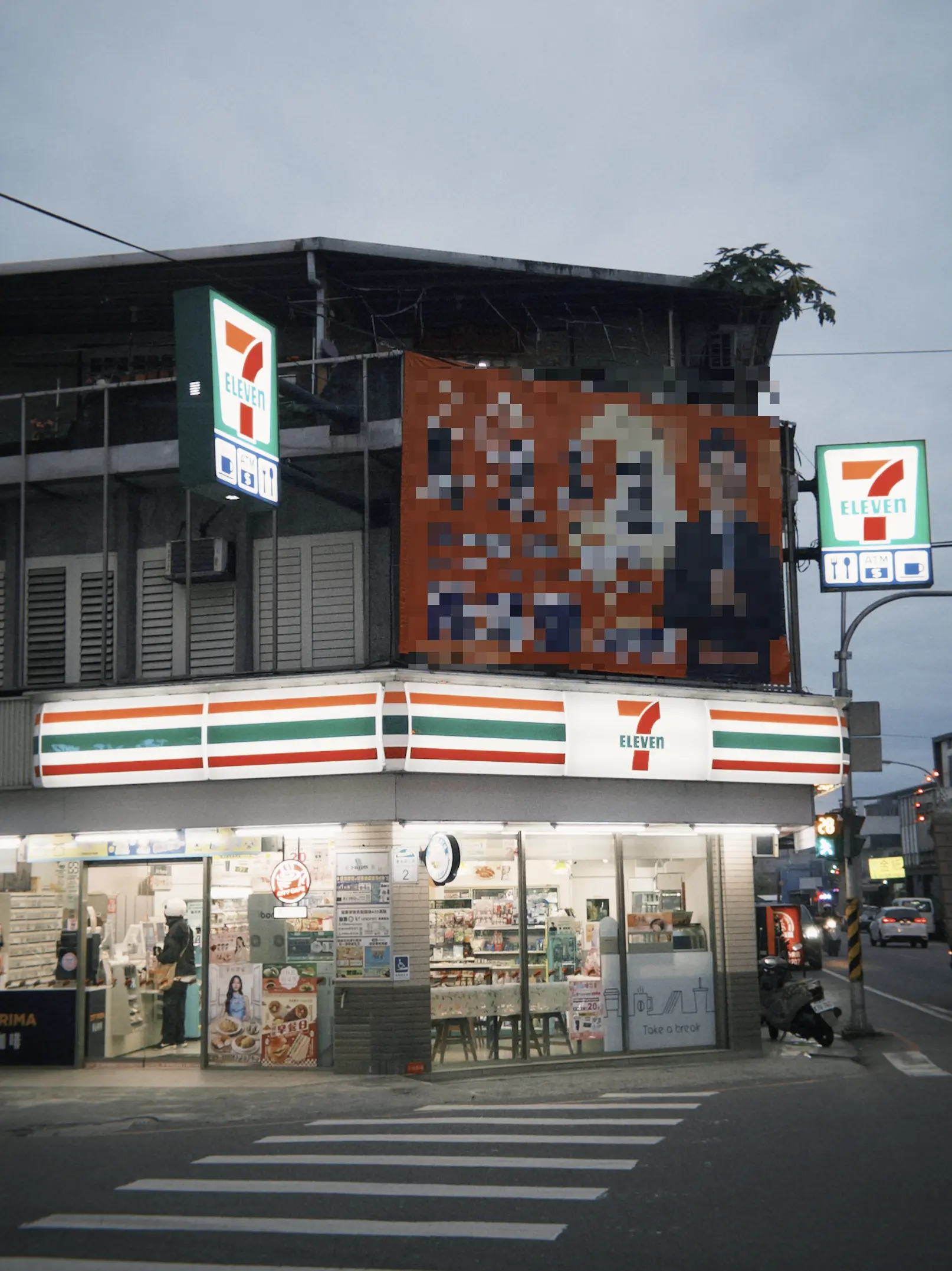 還有 7-ELEVEN 的看板也很特別,一般我們常見的是下面左邊的那種,內側有燈箱、燈條的塑膠中空版招牌,白色背景中間配上大大的「7」字 logo 標誌,左右部分則是由上至下間隔的橘、綠、紅色線條;偶然在路邊看到的這家 7-ELEVEN 卻使用米黃色鐵皮當背景,我想是因為二樓同樣是米白色鐵皮加蓋(違建?)的關係吧,而 7-ELEVEN 字樣的立體字就直接鑲嵌與其上。雖說論及美感多數人肯定覺得無法相提並論,它卻讓我想京都街道上,彩度被降低的各個店面招牌呢。