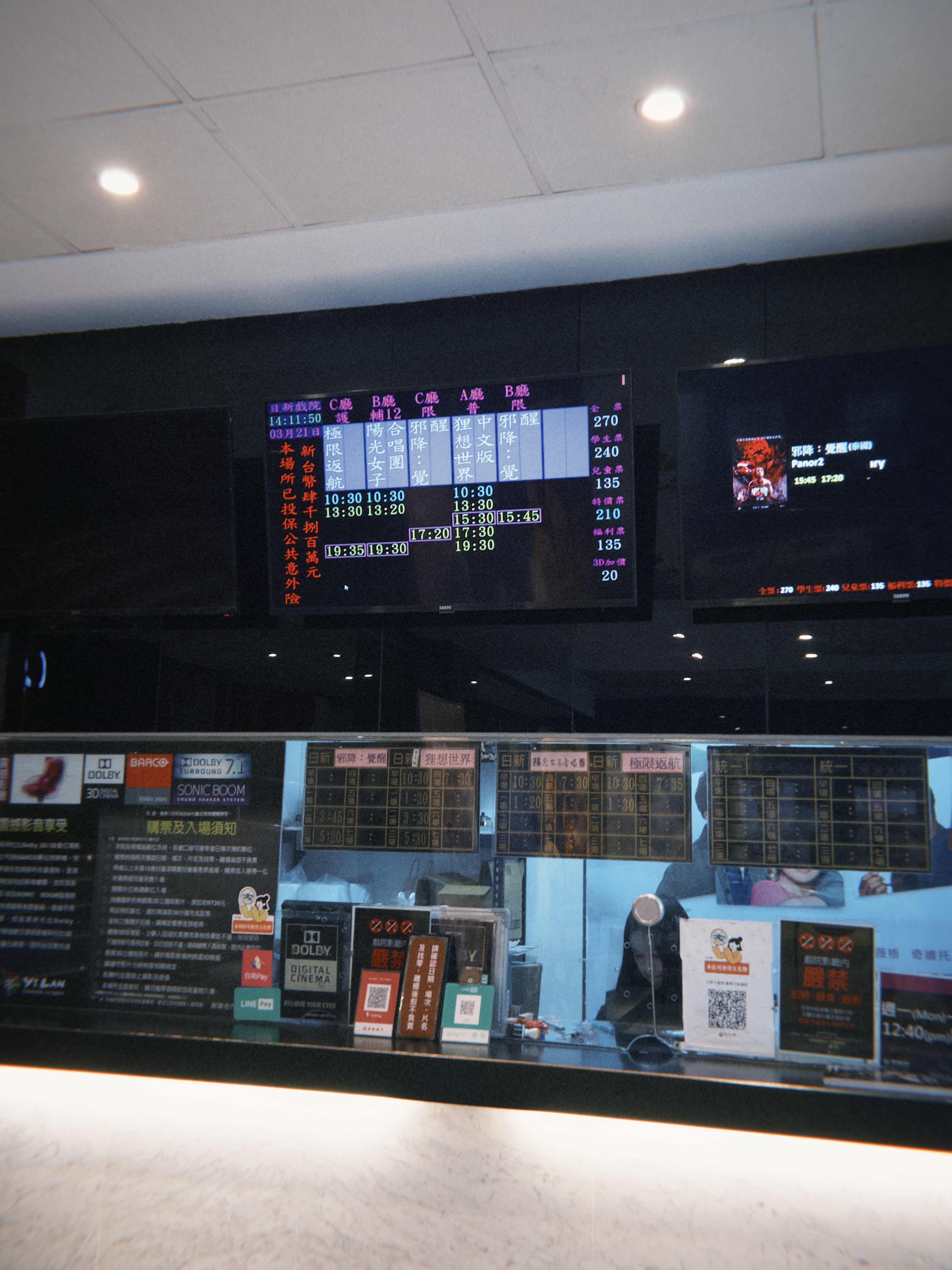 這間電影院不管是外觀或顯示電影時刻表的螢幕都相當復古,總共也只放映四部電影。朋友跟我說,在地人都是去旁邊的金玉堂買一張 200 塊的兌換券,再去現場櫃檯劃位,現場買反而比較貴。