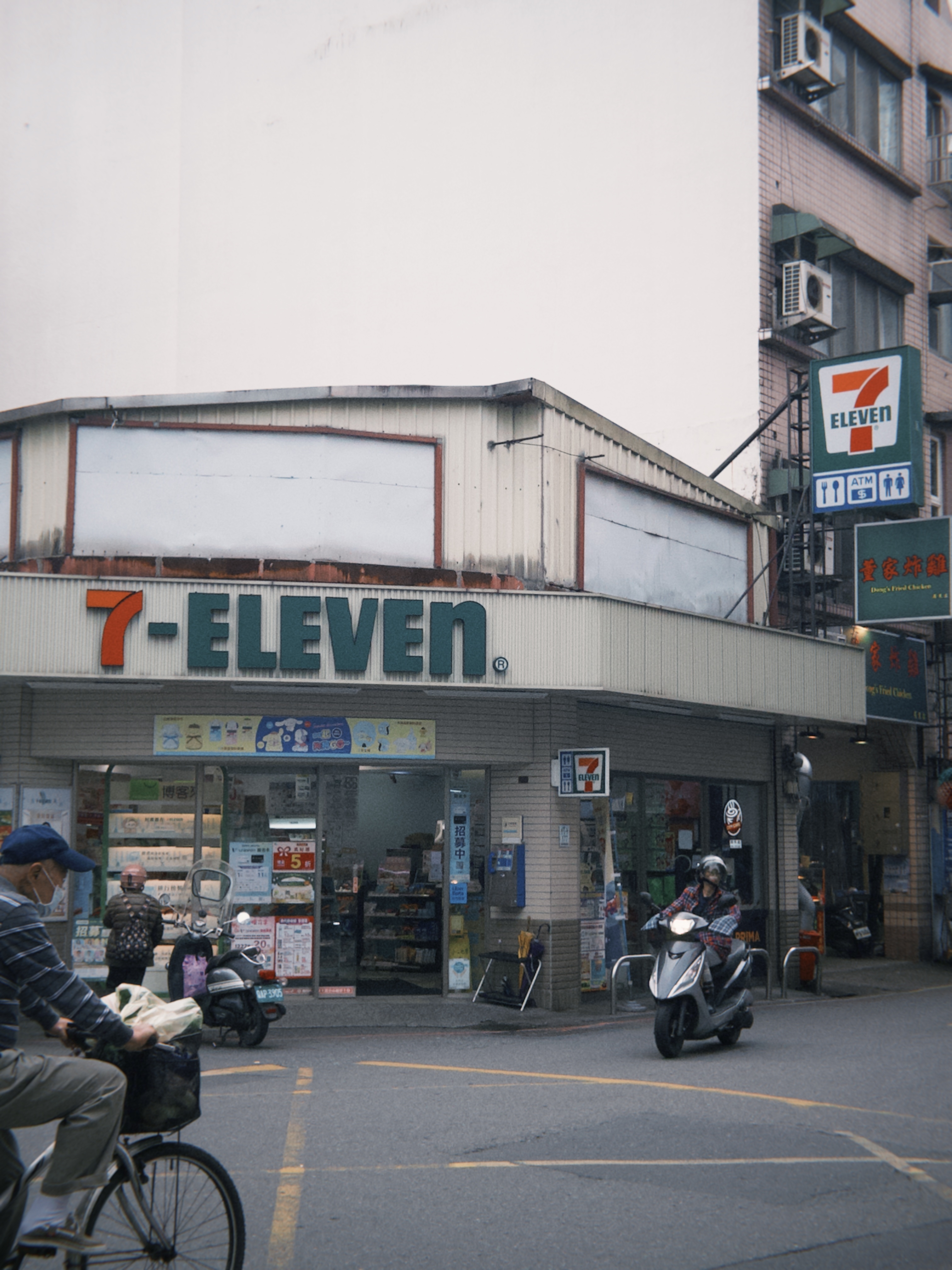 還有 7-ELEVEN 的看板也很特別,一般我們常見的是下面左邊的那種,內側有燈箱、燈條的塑膠中空版招牌,白色背景中間配上大大的「7」字 logo 標誌,左右部分則是由上至下間隔的橘、綠、紅色線條;偶然在路邊看到的這家 7-ELEVEN 卻使用米黃色鐵皮當背景,我想是因為二樓同樣是米白色鐵皮加蓋(違建?)的關係吧,而 7-ELEVEN 字樣的立體字就直接鑲嵌與其上。雖說論及美感多數人肯定覺得無法相提並論,它卻讓我想京都街道上,彩度被降低的各個店面招牌呢。